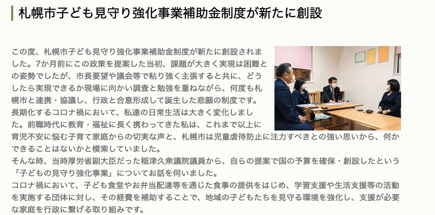 - 2020年12月元厚生労働副大臣稲津久衆議院議員がNPO北海道ネウボラ拠点ハッピー・ファム合同会社(当時事務所東区)へ来社。厚生労働省施策である子どもの見守り強化事業についての説明を受け、NPO北海道ネウボラのこども弁当・訪問支援事業と一致することを確認、公明党として札幌市へ議会提案し、事業化していくことを目指す旨をご提案いただく