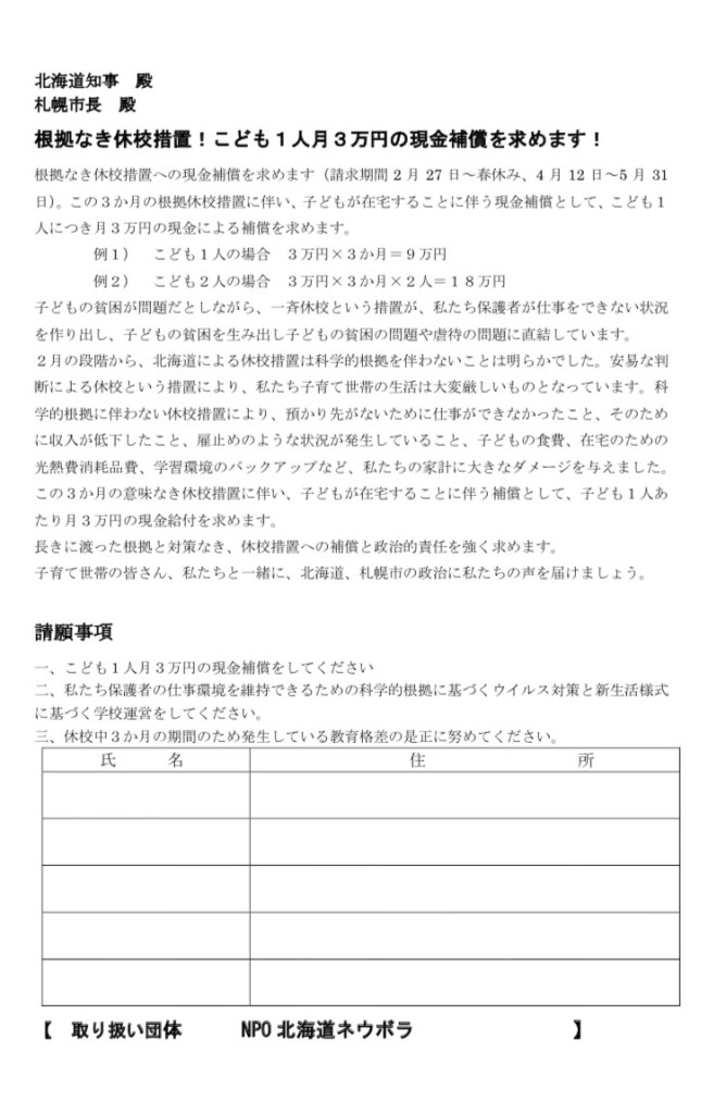 北海道、札幌市による根拠なき休校措置に対して、3か月の休校期間の現金補償(こども1人月3万円=3か月9万円)を求めます。