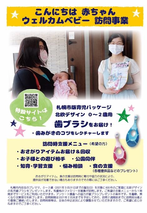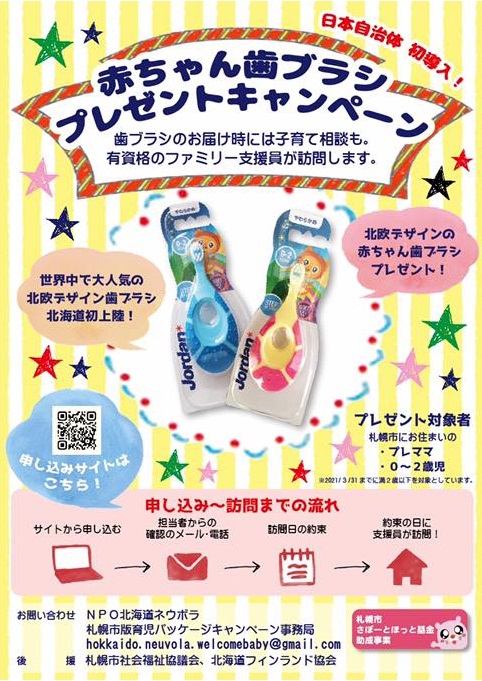 少子高齢化により、少数派となってしまった子育て世帯を結び、子育ての負担と悩みに寄り添う、ネットワークを構築することを目的に、フィンランドネウボラで産後もらえる育児パッケージになぞらえ、札幌市版育児パッケージ北海道初上陸の北欧デザイン歯ブラシプレゼントキャンペーンによる訪問活動を実施します。